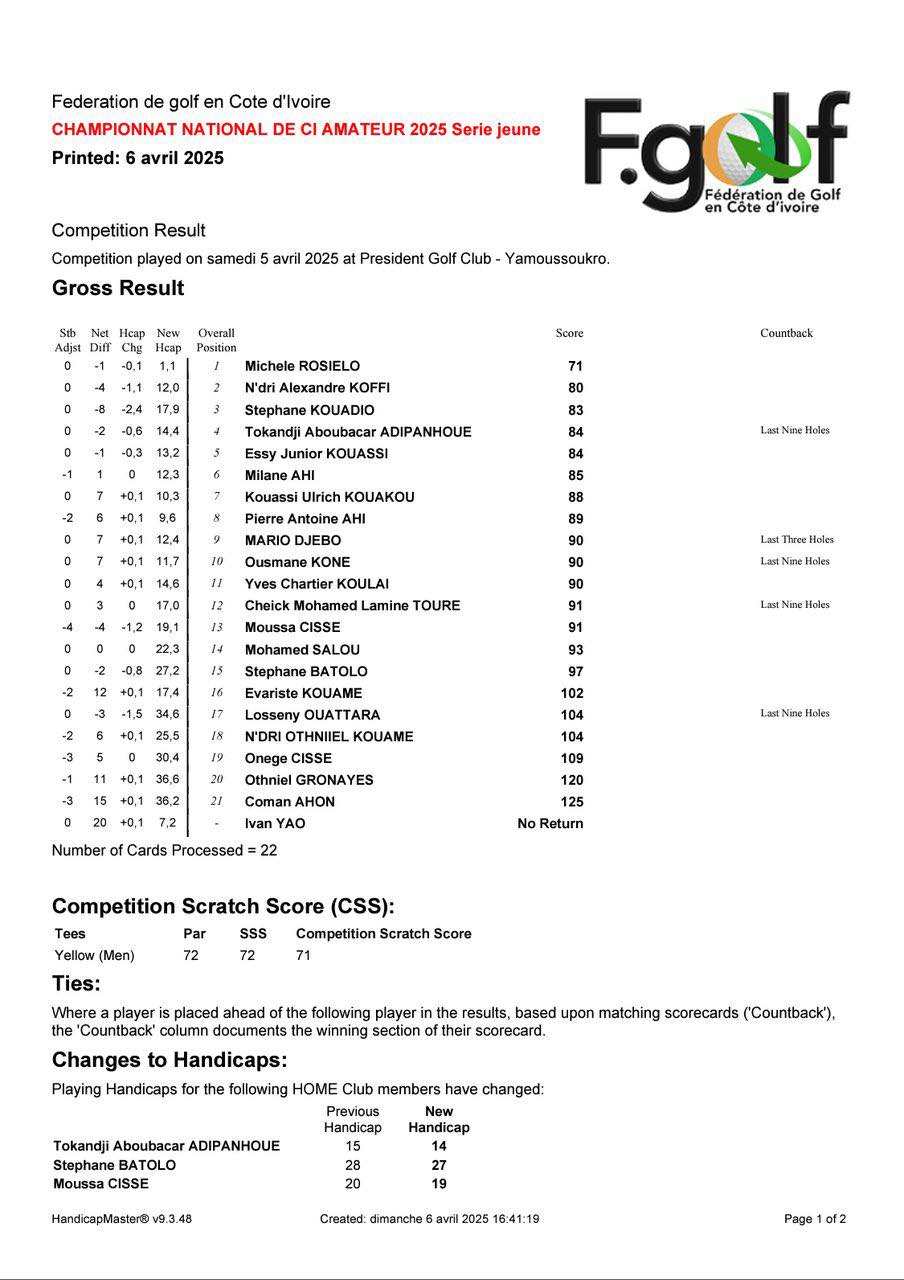 Le golf ivoirien a vibré au rythme de la jeunesse du 3 au 5 avril 2025 à Yamoussoukro, lors du Championnat National de Golf. Nos jeunes académiciens ont fièrement représenté notre académie avec détermination, passion et talent, inscrivant leurs noms parmi les meilleurs espoirs de la discipline en Côte d’Ivoire.